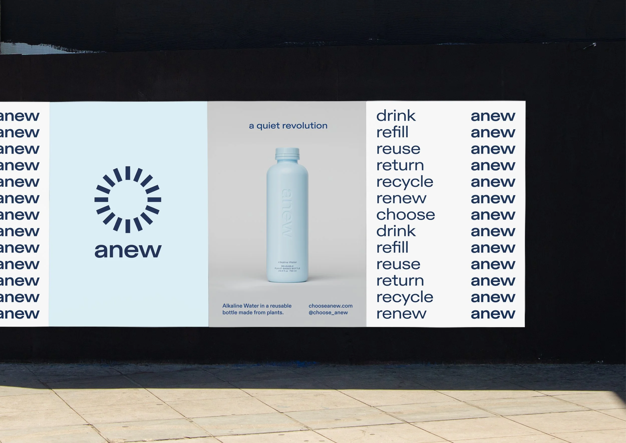 DMY partnered with For The Better Good to rebrand their compostable bottled water as a recyclable, plant-based alternative in the competitive single-use market. Tasked with creating a unifying brand identity, we chose the name “Anew,” representing renewal and circularity. This new name supports a flexible, memorable call to action—“Drink Anew,” “Choose Anew”—underscoring the brand’s commitment to sustainable solutions. Our logo design conveys optimism and circularity, adaptable for future plant-based materials. We worked with the client to design a custom bottle in a distinctive blue, signalling ‘water’ and creating a strong visual impact in retail fridges and for their public collection bins. To capture the product’s ethos, we emphasised ease of recycling and reusability, creating a collection system for used bottles. Through campaign imagery and messaging, we positioned Anew as a user-friendly, renewable alternative for consumers and businesses looking to reduce their plastic dependency. The launch marked Anew as a practical, sustainable choice in the bottled water sector and beyond.
